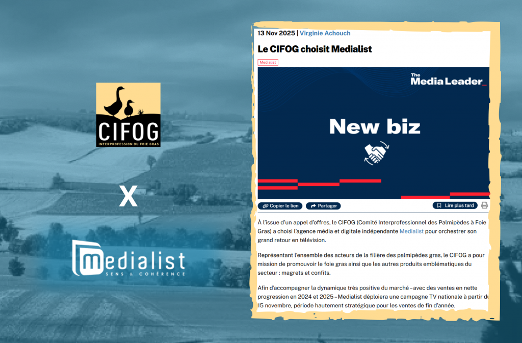 Le Cifog, Comité Interprofessionnel des Palmipèdes à Foie Gras 🦆, choisit Medialist pour son retour en média sur cette fin d’année. C’est notre contribution à la défense d’une filière d’excellence, de l’agriculture et la gastronomie françaises, d’un art de vivre et de la fête auxquels nous sommes attachés